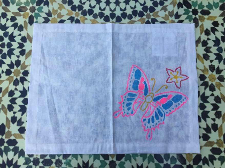 Das Platzset werde ich wohl nicht wirklich nutzen. Das Ergebnis ist mir durch die Farben doch zu kitschig geworden. Aber ich wollte die Schablonen und die Textilfarben einfach mal ausprobieren. Mein Ergebnis: