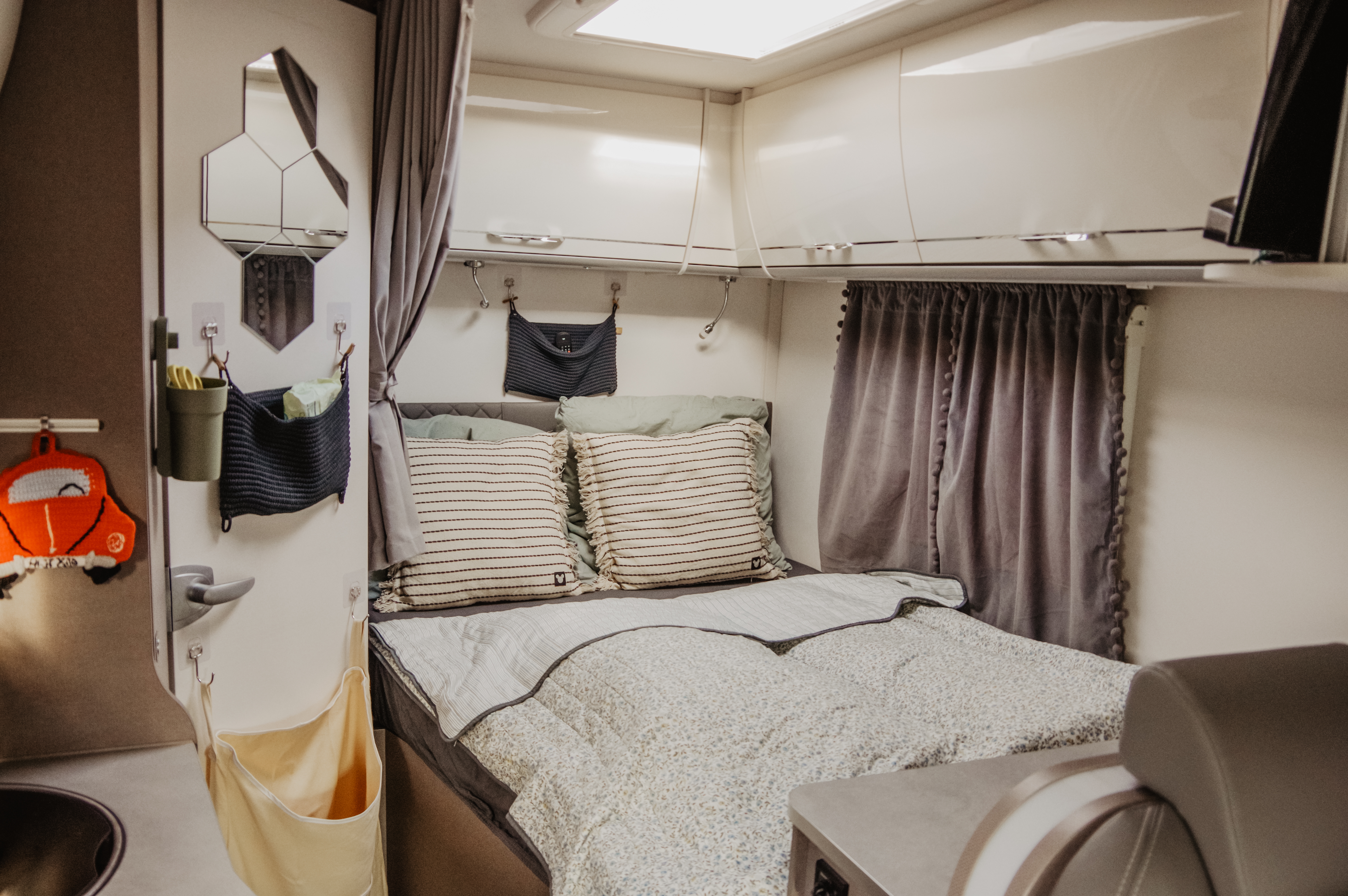 Im hinteren Bereich befindet sich das Doppelbett und im vorderen Bereich ein Hub Bett, welches bei Bedarf heruntergefahren werden kann. So haben wir 3-4 Schlafplätze und 4 zugelassene Sitzplätze. Die Fahrersitze lassen sich drehen, so dass man bequem am Tisch sitzen und Zeit verbringen kann.